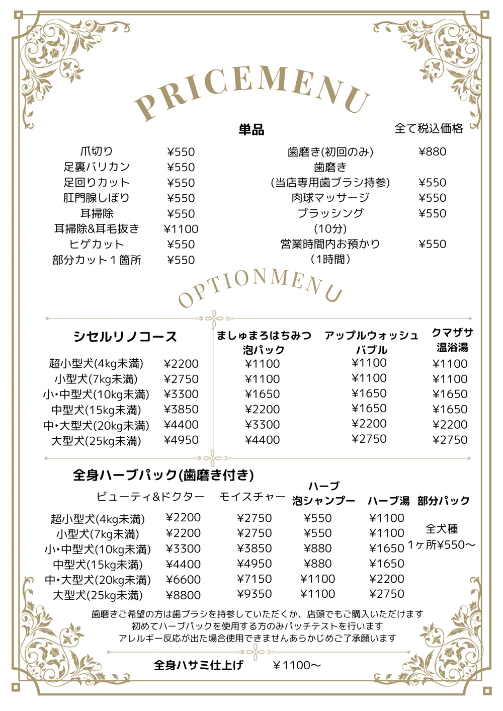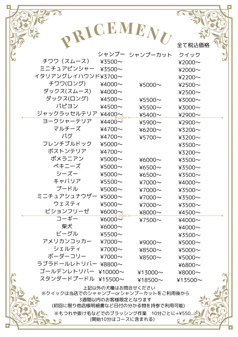 犬種別メニューはコース・料金表をご覧ください。